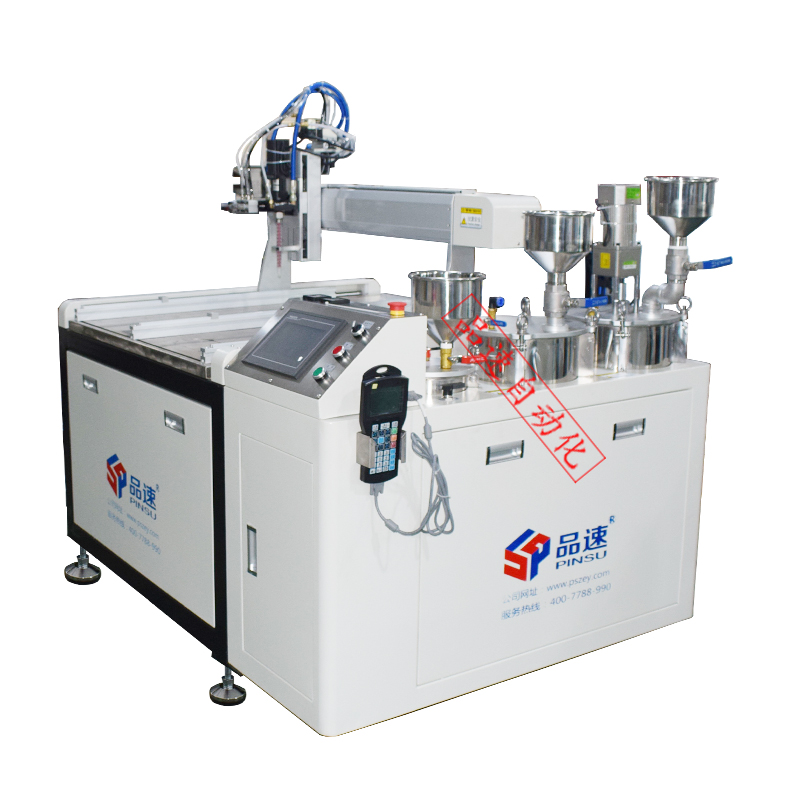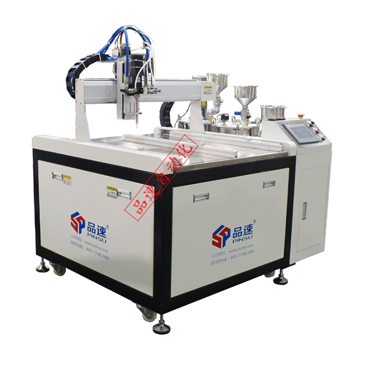品速科技生产落地式自动灌胶机采用三轴龙门架设计而成,具有大平台大行程的特点;适用1:1-10:1环氧树脂ab胶,聚氨酯PU胶,硅胶等ab胶水自动配比,自动出胶。