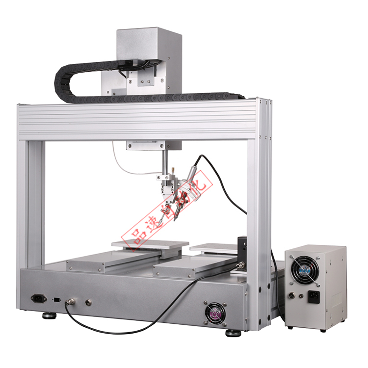 桌面式五轴自动焊锡机也被称为双工位自动焊锡机,双Y轴自动焊锡机等,双工位平台生产,一边对产品进行焊锡,一边摆放产品,焊接品质高,生产效率快。
